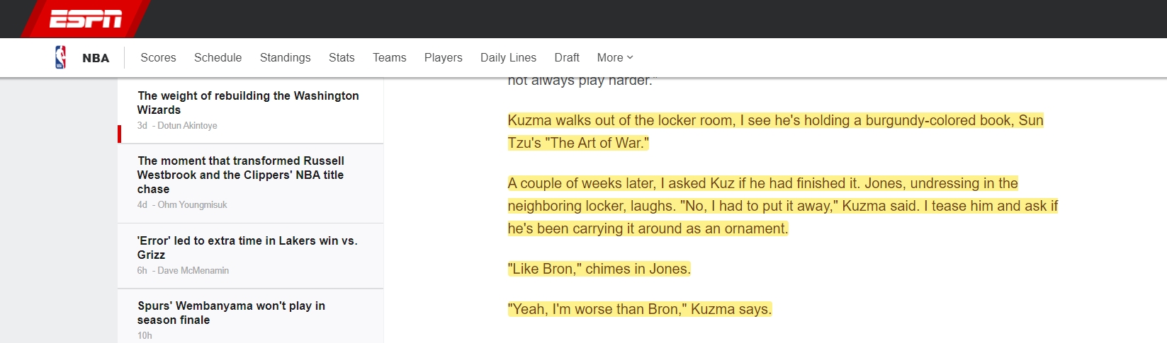 我看到库兹马抱着孙子兵法(The Art of War)》走出更衣室,过了几天,我问库兹马:“你读完那本书了吗?”