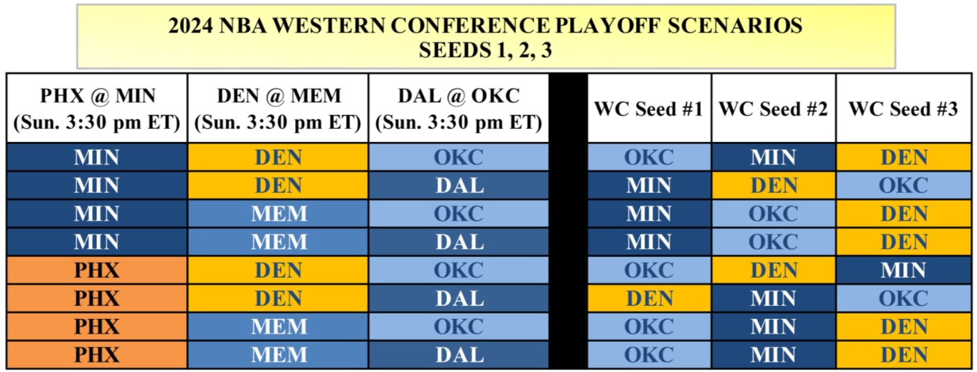 雷霆明天至少会在西部赢得前两名。在这种情况下,只有一种可能成为第二名:森林狼赢了 掘金输球。
