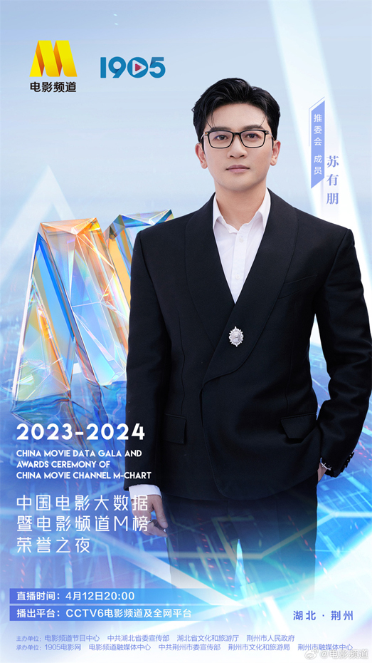 4月12日,2024中国电影大数据荣誉之夜在湖北荆州举行,导演、演员苏有朋作为2023-2024年度中国电影大数据暨电影频道M榜荣誉之夜推委会委员亮相活动,以专业视角关注中国电影产业发展,权威推选年度佳作与杰出影人,致敬中国电影年度发展成就。