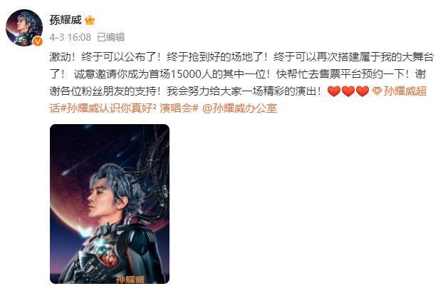 据悉,演唱会将融合电影感和舞台剧形式演绎孙耀威的故事,还有一些未发行的全新音乐作品,孙耀威透露,最近正筹备新歌以及实体专辑,“专辑会有我的一些成名曲,还有一些比较不一样的类型的歌曲,例如很疯狂的说唱,可能快速到人类极限,很多人可能想象不到一个香港同胞能够把普通话说得那样快。另外我还希望演唱会之后能够给粉丝做一些纪念版的实体专辑”。