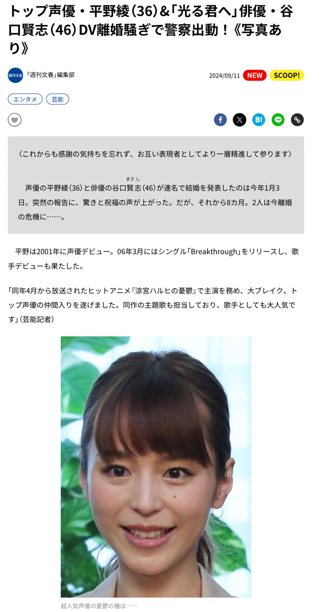 据日媒周刊文春爆料称,著名声优平野绫与丈夫谷口贤志的婚姻因涉嫌家暴而引来了警察,两人也最终决定协议离婚。