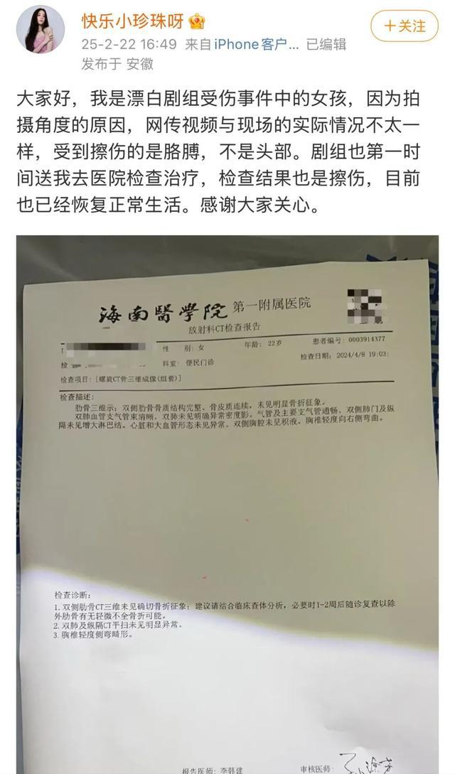 2月22日16时许,自称是视频中女替身的网友放出去年4月海南医学院第一附属医院的放射科CT检查报告,表示自己正是《漂白》剧组受伤事件中的女孩,她澄清道: