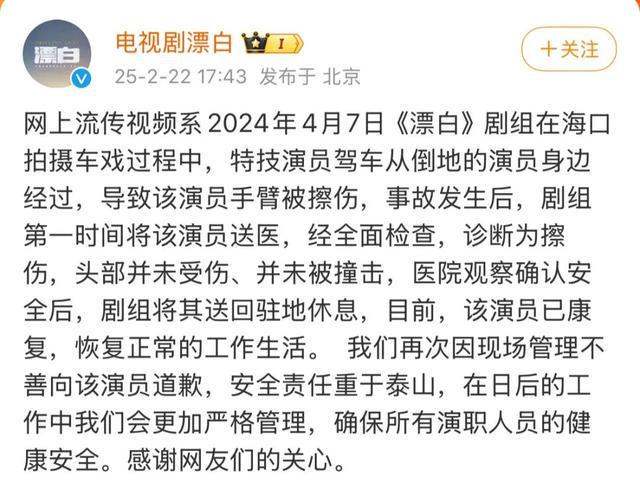 “网上流传视频系2024年4月7日《漂白》剧组在海口拍摄车戏过程中,特技演员驾车从倒地的演员身边经过,导致该演员手臂被擦伤,事故发生后,剧组第一时间将该演员送医,经全面检查,诊断为擦伤,头部并未受伤、并未被撞击,医院观察确认安全后,剧组将其送回驻地休息,目前,该演员已康复,恢复正常的工作生活。我们再次因现场管理不善向该演员道歉,安全责任重于泰山,在日后的工作中我们会更加严格管理,确保所有演职人员的健康安全。感谢网友们的关心。”