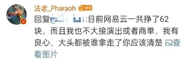 “目前网易云一共挣了62,而且我也不大接演出或者商单,我有良心,大头都被谁拿走了你应该清楚”