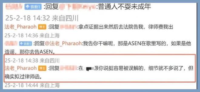 当时ASEN在歌曲中提到了“未成年”,这让法老认为是造谣,在当时准备了律师函。