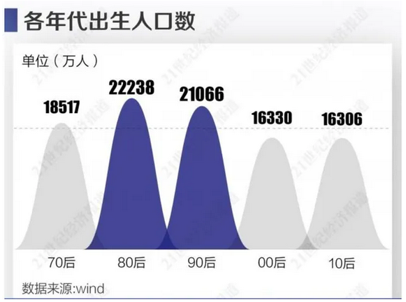 90后仅有2.1亿,比80后少1172万;00后又比90后少4700多万;10后比00后也少了24万。