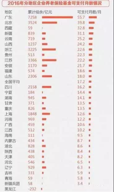 从2016年全国养老保险可支付月数情况表中,我们可以看出很多省份的血槽已经快见底了。