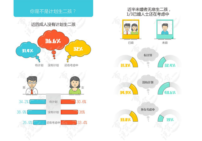 根据《二孩调查分析报告》显示:适龄适孕的群体中,36.6%的人没有计划生育二胎,而在未婚的群体中,更是有超过一半的人没有意愿生二胎。