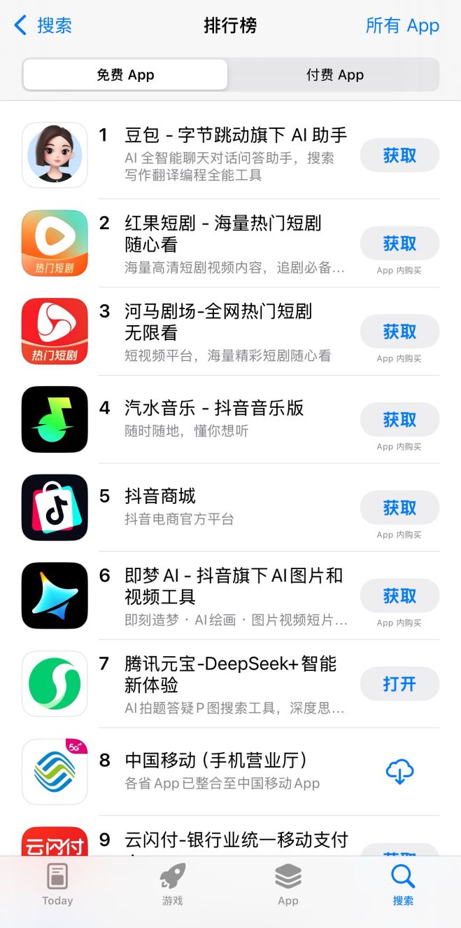 从App Store数据看,中国区免费榜已经出现了被“字节霸榜”的现象。在榜单前6名中,有5款应用来自字节跳动,分别是豆包、红果短剧、汽水音乐、抖音商城和即梦AI。