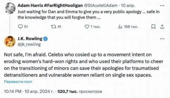 “艾玛·沃森和几位合演者当然有权支持‘性别认同’理念。这类信念在法律上是受保护的,我也从来不希望他们因此丢掉工作,甚至遭遇暴力或死亡威胁。