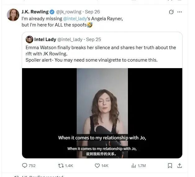 在艾玛播客发出两天后,罗琳就在推特大号上转发了一段恶搞艾玛的视频。