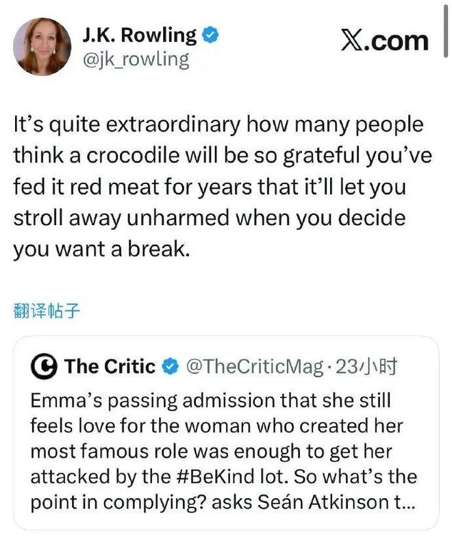 这次艾玛的采访没过多久,罗琳又再次转发了一条关于艾玛的评论帖子说: