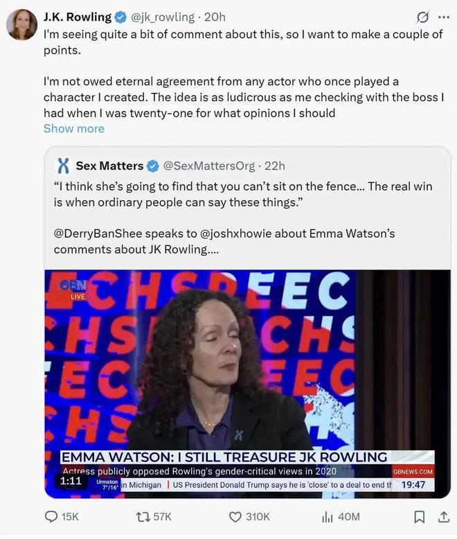 接着,她点名提到了艾玛那句“所有女巫”。她转发的切片里,主持人提到罗琳的讽刺回应是为了反击艾玛当年的言论,但罗琳说其实她真正伤心的不是艾玛公开发表言论,而是后续……