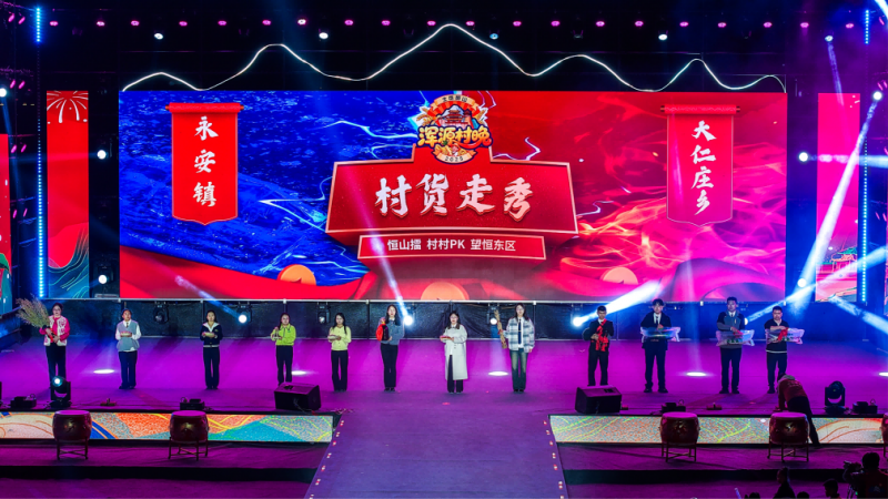 活动现场亮点频现:《恒山论剑》借武侠经典展现浑源恒山、悬空寺等旅游文化底蕴与黄芪特色;16支队伍集体登台亮相,“恒山擂村村pk”比赛规则宣布;大仁庄乡的村官们带来说唱《三句半》,以接地气的表演形式,既生动讲述了乡村发展变迁的历程,又鲜活展现了当地土特产的独特特点;永安镇则推出《特产摇》,创新采用说唱与舞蹈相结合的方式,将乡镇的特色风貌直观且富有活力地呈现出来;村货走秀环节中,本场PK的队伍大仁庄乡和永安镇特色产品集中亮相,线上直播间同步带货,实现“文化展示+产业推广”双向赋能。此外,知名歌手“安与骑兵”献唱经典曲目引发全场合唱,郭阳、郭亮相声《想唱就唱》带来欢声笑语。