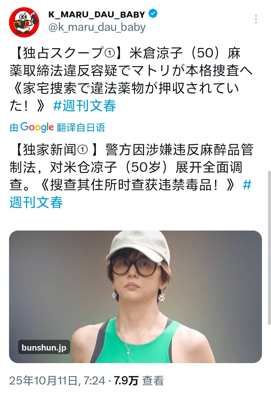 发表自话题: 据日媒报道,著名演员米仓凉子涉嫌违反《麻药取缔法》被正式调查。文春在今年6月上旬获得情报称,米仓凉子出现在麻药取缔部的侦查视线中。直至在8月20日,“从她的住所中,查获了多种根据《麻药取缔法》禁止持有的非法药物。同时,还发现了疑似用于吸食这些药物的器具。”根据报道表示,目前米仓凉子正在接受调查,有消息称,该住所是米仓凉子与现任男友的共同居住场所,男方是外籍人员,目前已经离开日本。 标签组: 上一篇:鳌拜手握重兵却未造反:权力困局下的忠诚与现实 下一篇:乾隆登基后,为何要毁掉钮祜禄&·阿灵阿的墓碑?