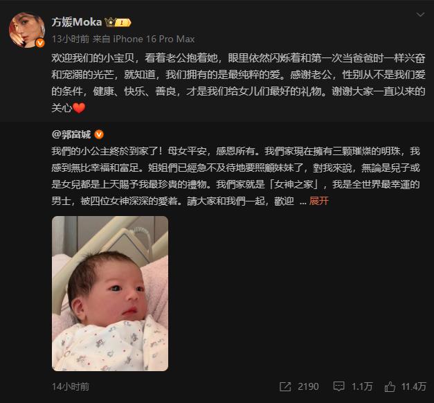 与此同时,方媛也发文:“欢迎我们的小宝贝,看着老公抱着她,眼里依然闪烁着和第一次当爸爸时一样兴奋和宠溺的光芒,就知道,我们拥有的是最纯粹的爱。感谢老公,性别从不是我们爱的条件,健康、快乐、善良,才是我们给女儿们最好的礼物。谢谢大家一直以来的关心。”