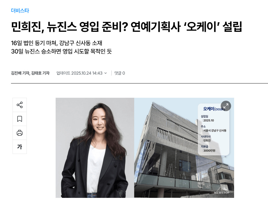 闵熙珍于本月16日完成了股份公司OK的法人登记。公司业务范围包括:演艺人员经纪代理 ,音乐制作、唱片制作、音乐及唱片流通 ,演出及活动策划制作等。这是闵熙珍表自2024年11月离开ADOR后,首次开启新的事业。