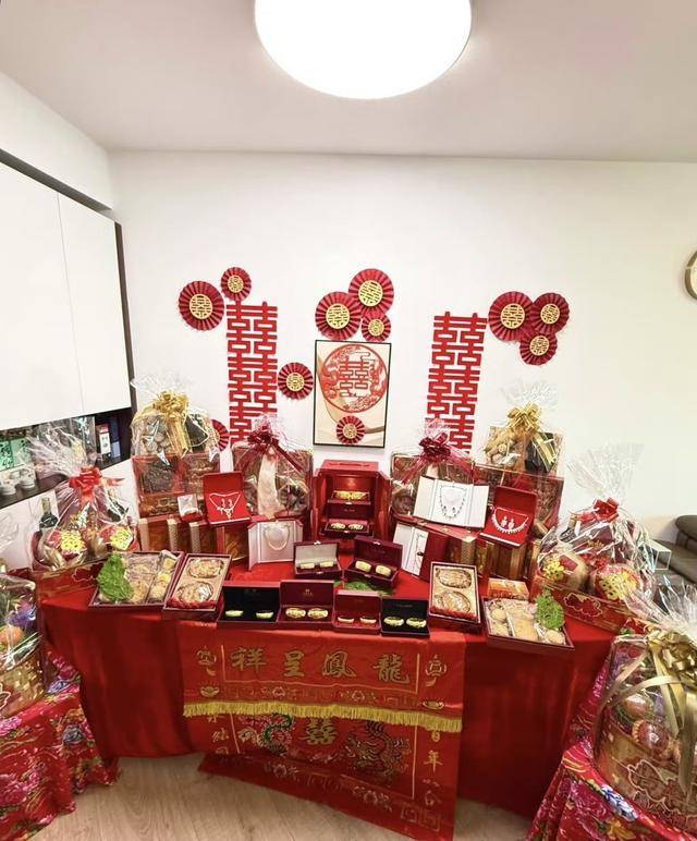 在此基础上,一些金链和钻饰也是非常吸睛,按照当地的传统,过大礼都需要摆满一整个桌子,并且需要在桌子上铺一块红布,为的是彰显喜庆。