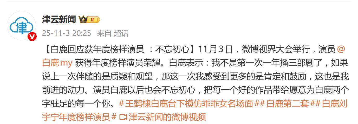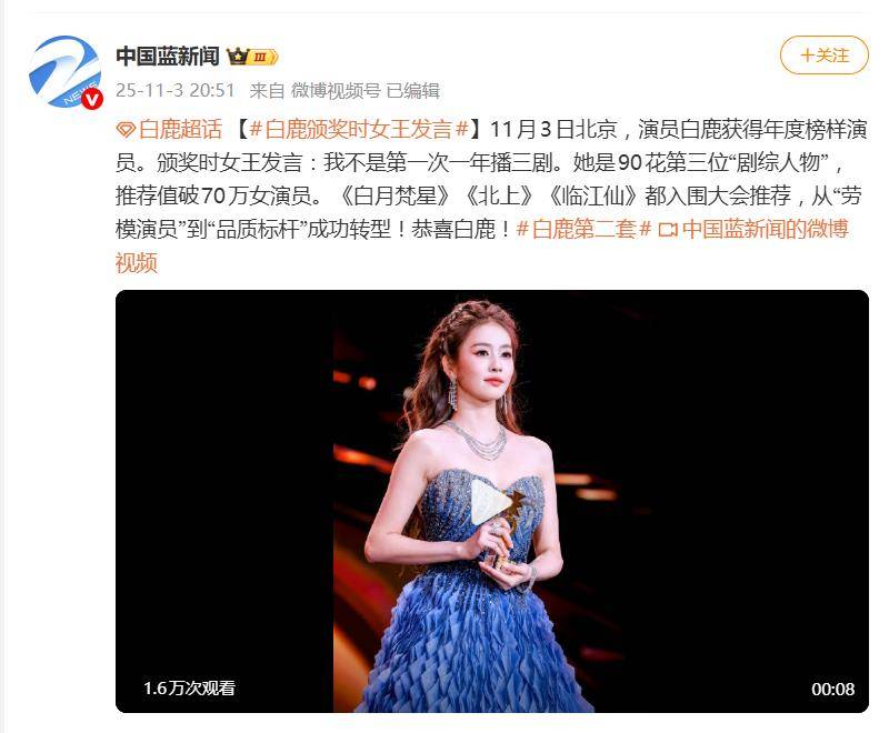 “我不是第一次一年播三部剧了!”——白鹿在2025年11月3日“微博视界大会”上斩获“年度榜样演员”时的一句发言,瞬间引爆网络,被媒体封为“女王发言”。这句看似简单的陈述,背后却是她从“被质疑”到“被肯定”的完整逆袭,妥妥上演了一出“用实绩打脸”的爽文剧情。