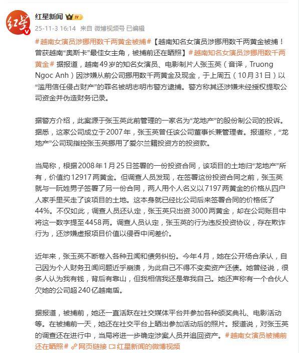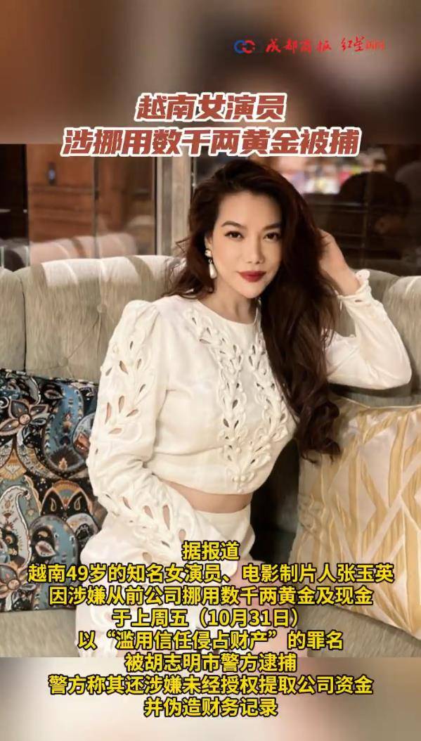曾被誉为越南影视圈“顶流”的女演员张玉英,这回可能要把自己的人生演成一部“法制片”了。据11月3日报道,10月31日,这位曾摘得越南“奥斯卡”——金杏奖最佳女主角桂冠的影后,因涉嫌挪用数千两黄金的惊天大案,被胡志明市警方正式逮捕,罪名是“滥用信任侵占财产”。
