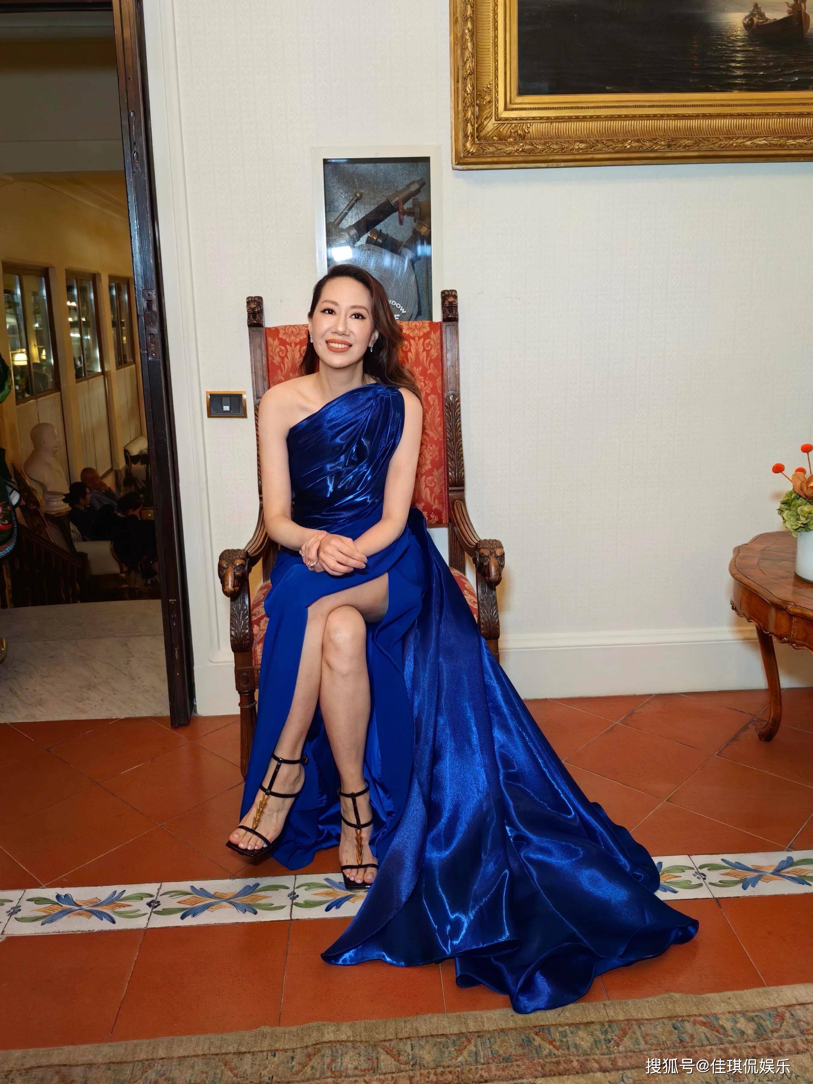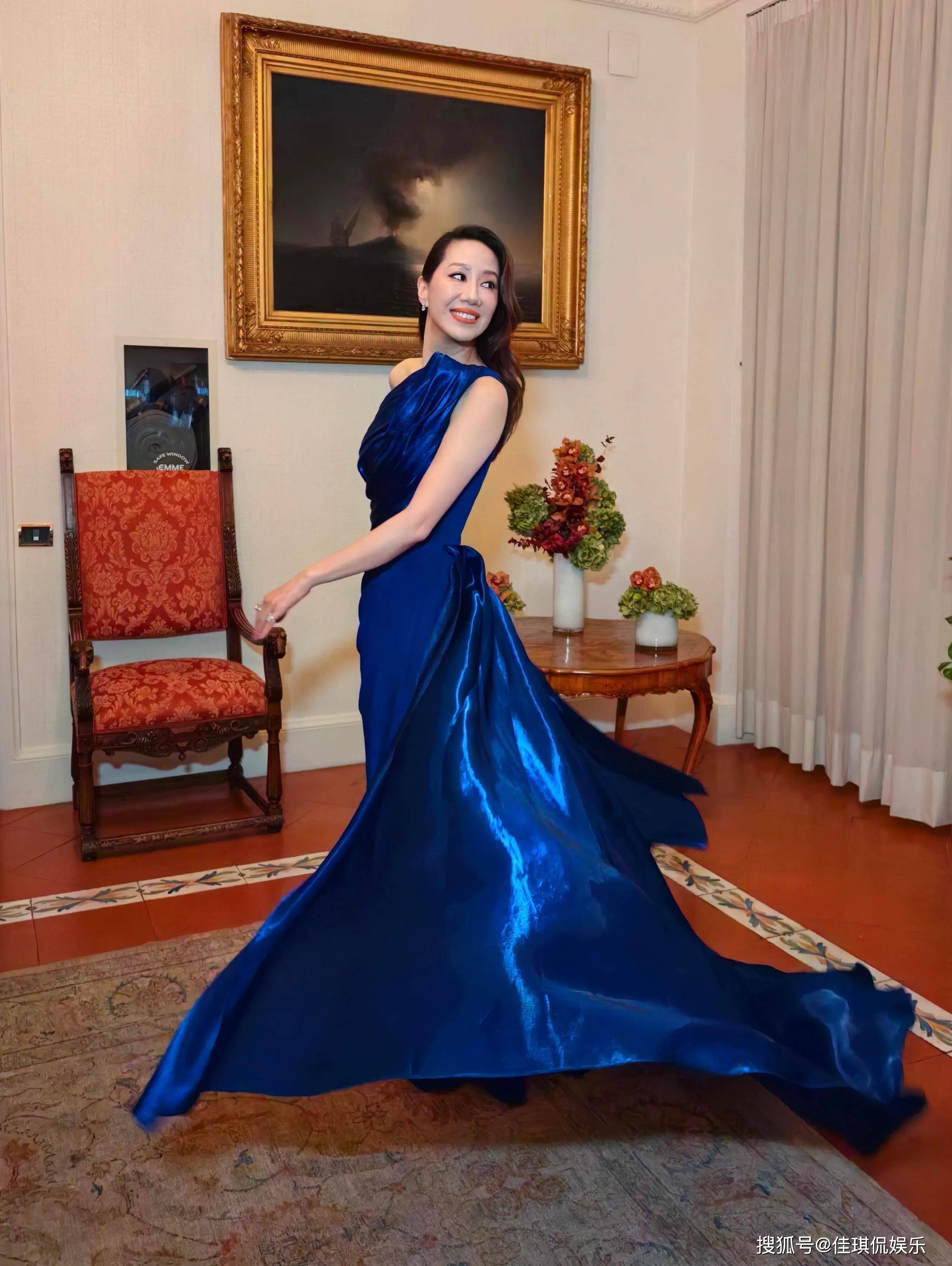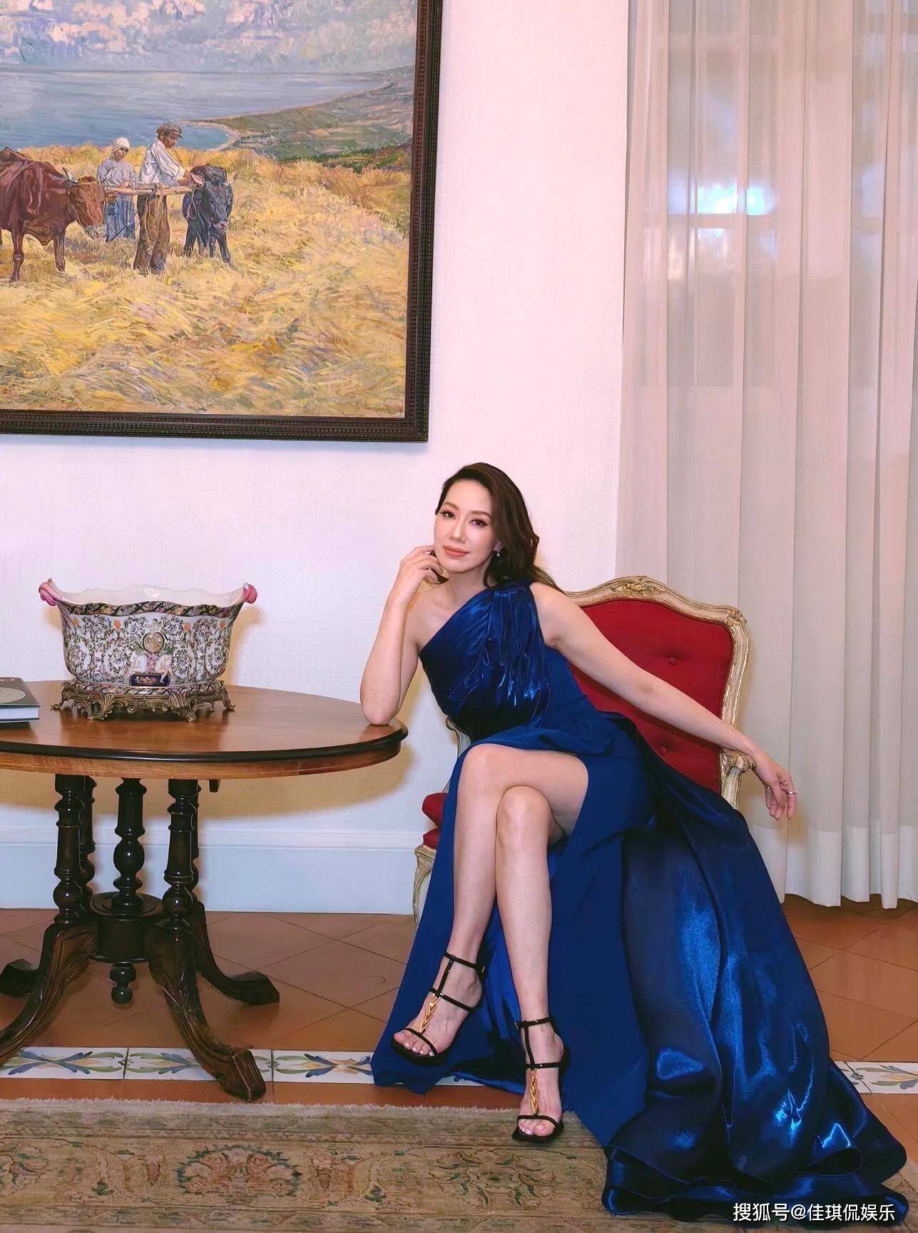 出席婚礼晚宴时,汪诗诗换上了一套宝蓝色的斜肩礼服,她的模特身材穿什么都好看。这条礼服裙摆处是高开叉设计,她的大长腿一览无余。