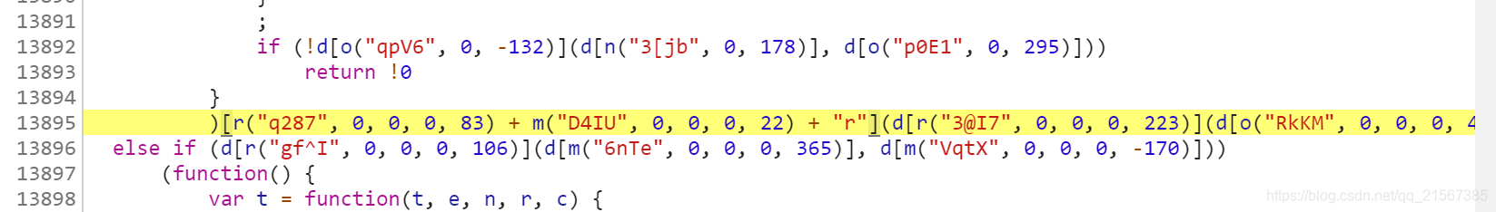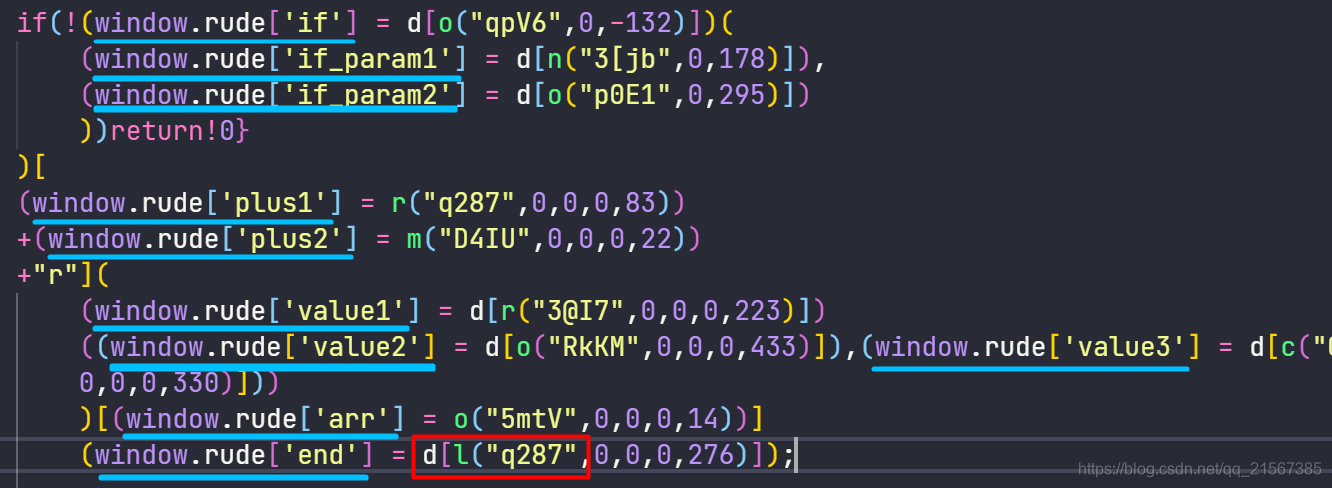 按之前控制台提示我们的那一行搜索 r("q287" 找到该处,之后把分号前相关的一部分逻辑做好全局赋值,方便我们查看。