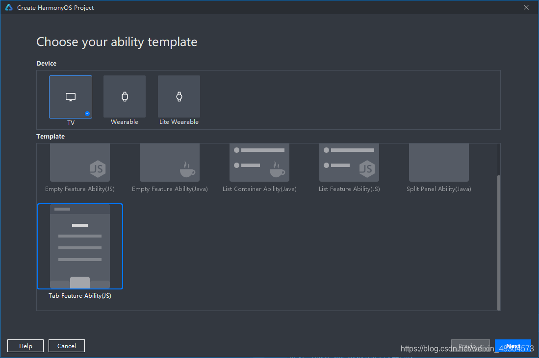 在File > New > New Project来创建一个新工程,选择Tab Feature Ability(JS)模板: