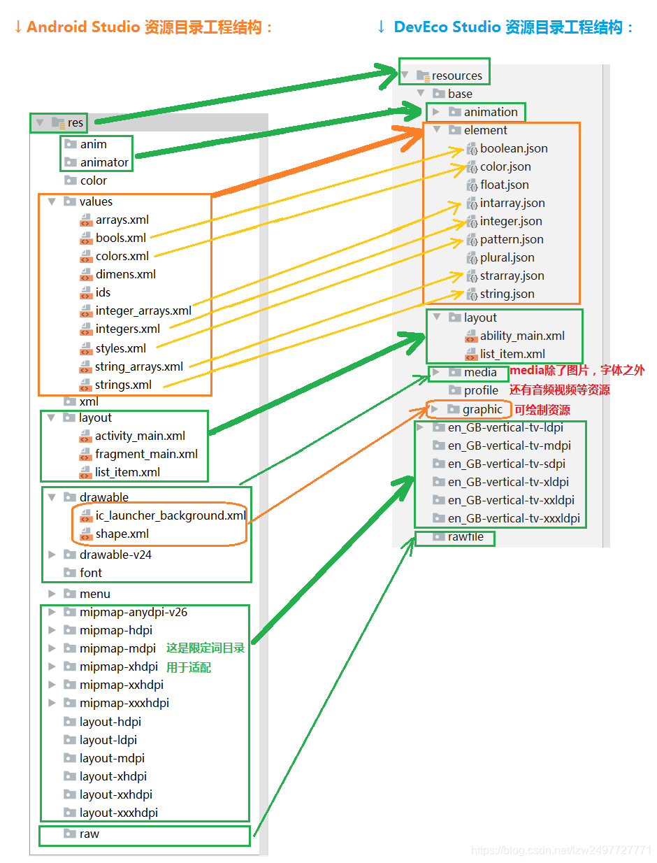 文件目录介绍 Android Studio res目录 采用格式 备注 DevEco Studioresources目录 采用格式 备注 资源目录根路径 res目录resources目录