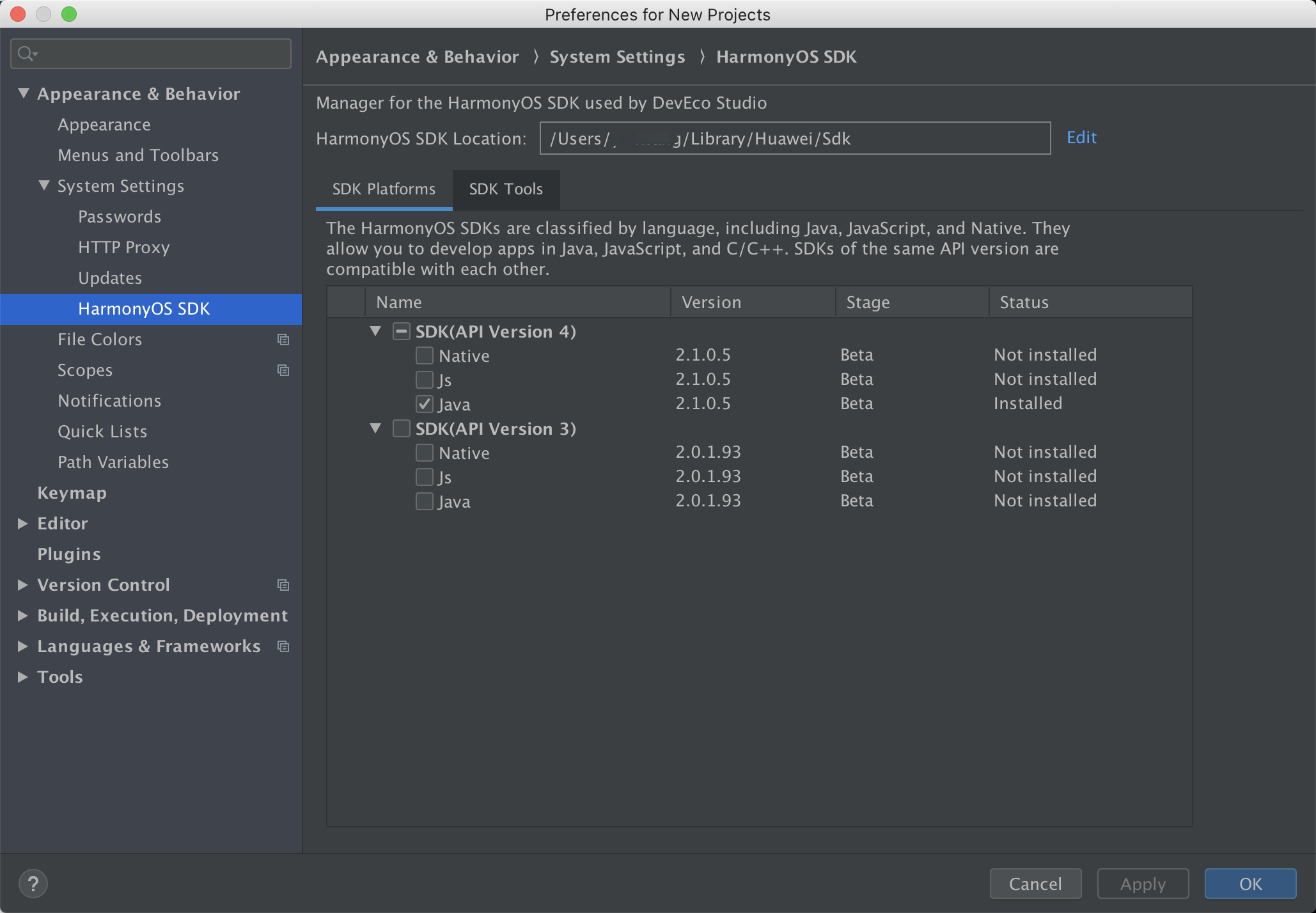 Apperance&Behavior—>System Settings—>HarmonyOS SDK,下载SDK Platforms和SDK Tools