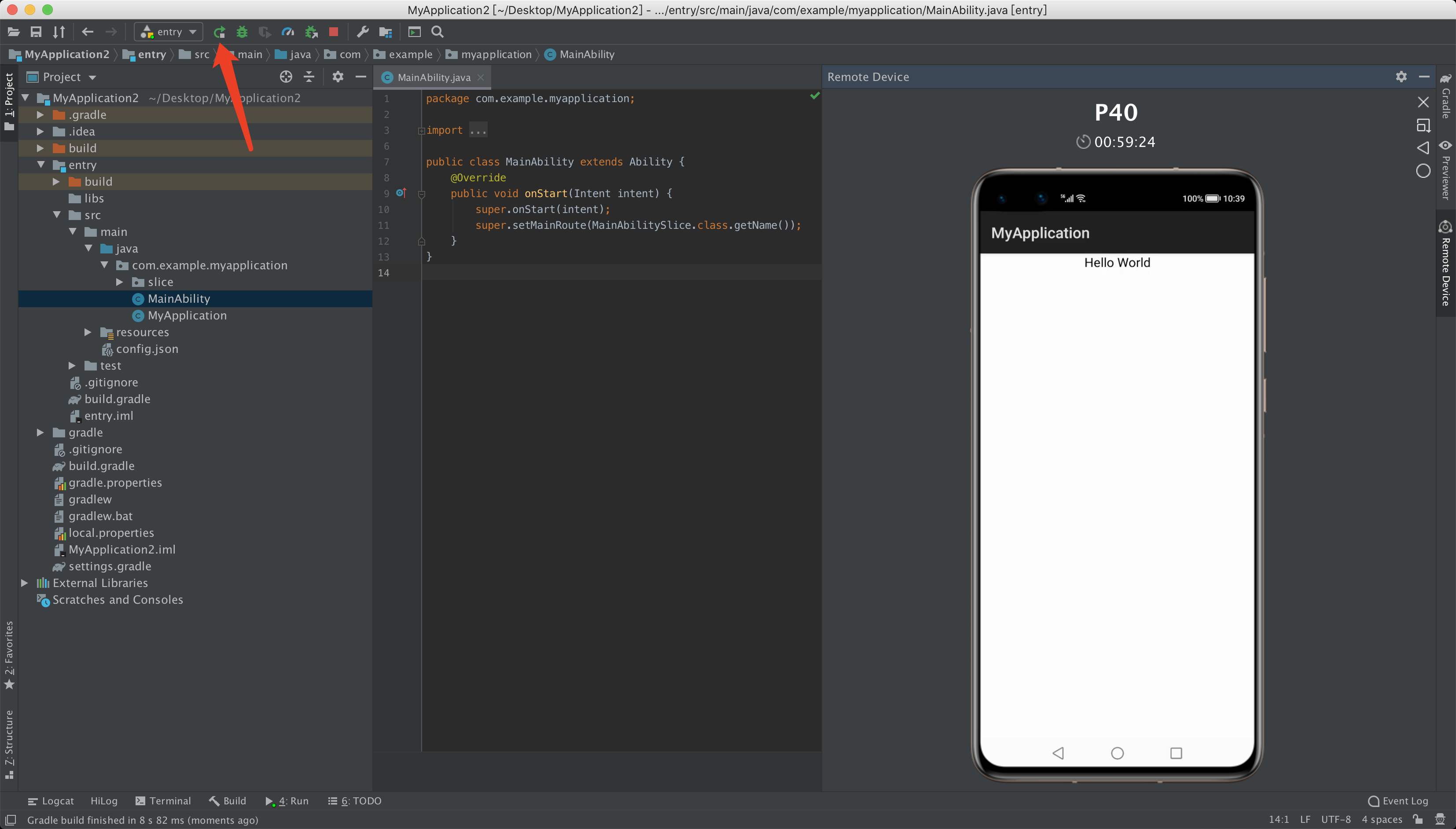 什么都不需要修改单击运行,一个hellowrld就出现在了p40模拟器上,至此完成从零开始创建一个鸿蒙os应用