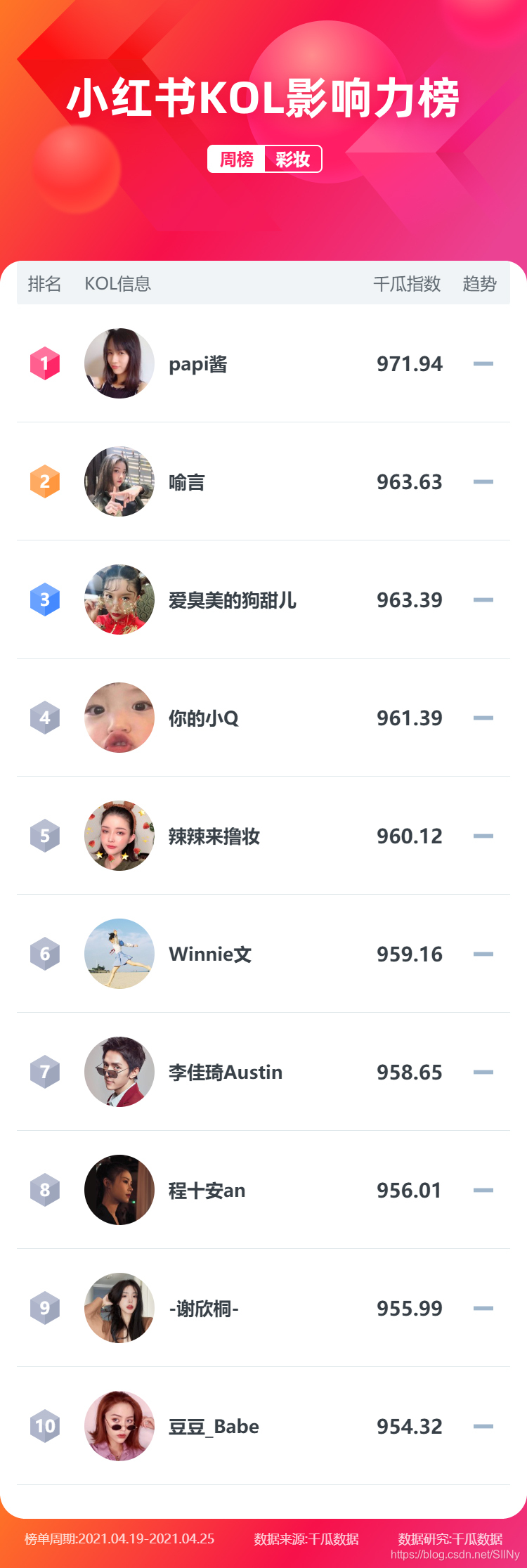 小红书KOL影响力榜-彩妆中“papi酱”排名第一,千瓜指数971.94;“喻言”排名第二,千瓜指数963.63;“爱臭美的狗甜儿”排名第三,千瓜指数963.39。