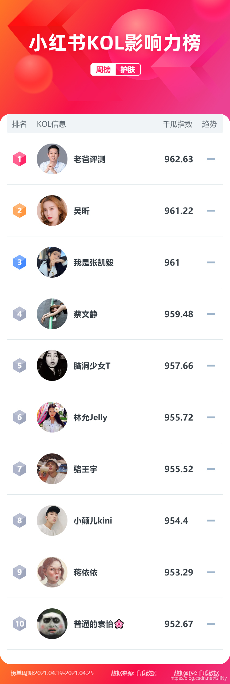 小红书KOL影响力榜-护肤中“老爸测评”排名第一,千瓜指数962.63;“吴昕”排名第二,千瓜指数961.22;“我是张凯毅”排名第三,千瓜指数961。