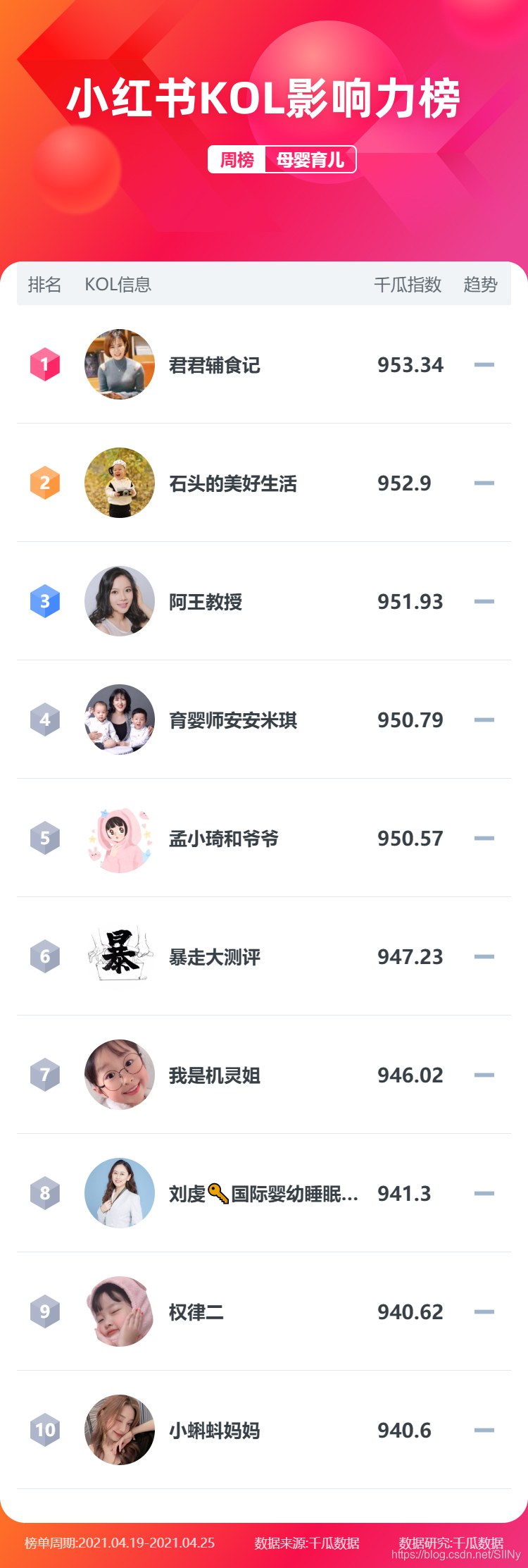 小红书KOL影响力榜-母婴中“君君辅食记”排名第一,千瓜指数953.34;“石头的美好生活”排名第二,千瓜指数952.9;“阿王教授”排名第三,千瓜指数951.93。