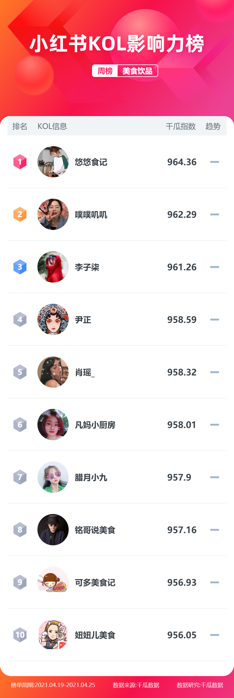 小红书KOL影响力榜-美食中“悠悠食记”排名第一,千瓜指数964.36;“噗噗叽叽”排名第二,千瓜指数962.29;“李子柒”排名第三,千瓜指数961.26。