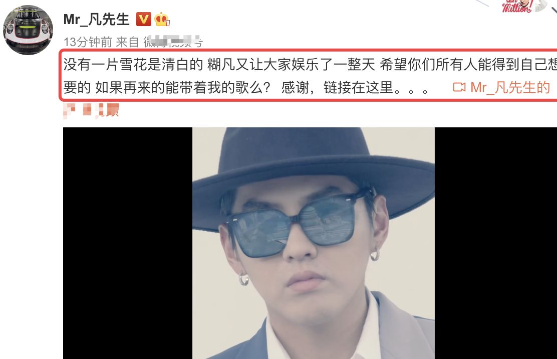 眼看着局势不可控,吴亦凡本人终于回应了。这次,吴亦凡自称“糊凡”,回应说:没有一片雪花是清白的。糊凡又让大家娱乐了一整天,希望你们所有人能得到自己想要的,如果再来的能带着我的歌么?感谢。