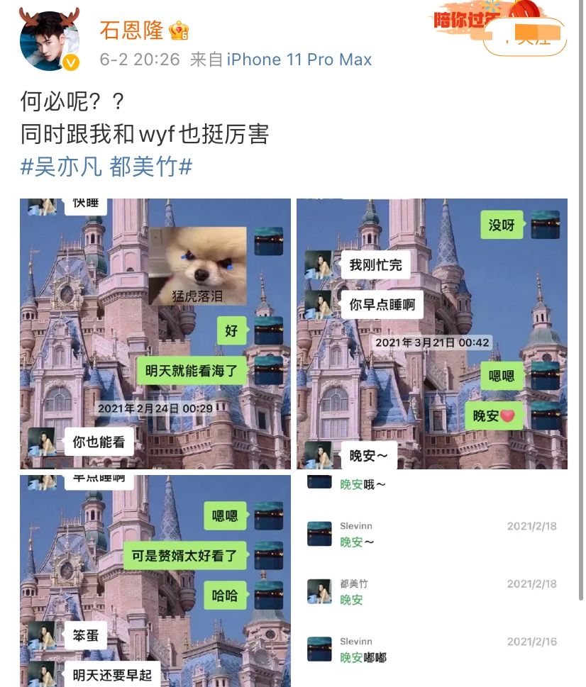 都美竹与这位男歌手的聊天记录是2月3月时期的,而都美竹的闺蜜爆料吴亦凡是从四月份开始玩消失,也就说说在四月份之前,都美竹都是与吴亦凡还有这位石恩隆两个人同时谈恋爱,虽然不能定义谁是真的小三,但吴亦凡与石恩隆应该都不知道对方的存在,两个人都被绿了。