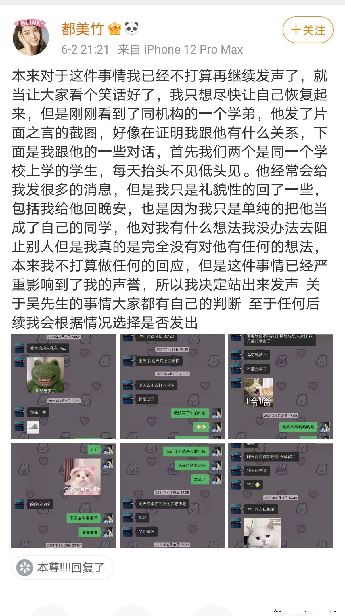 接着,都美竹通过社交平台发声明否认了与石恩隆的男女朋友关系,至于其与吴亦凡的感情纠纷,其并没有否认,而是说大家自有分辨。