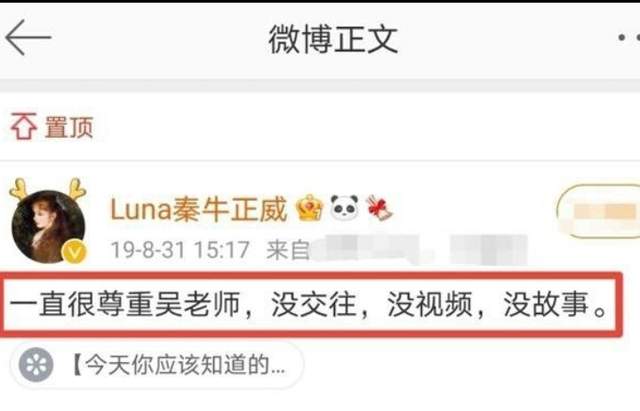 比较有意思的是,本来这次事件的主角为吴亦凡和都美竹,秦牛正威更像是个吃瓜群众,她与"吴都事件"没半分钱关系,可就因她曾是吴亦凡绯闻女友,所以也受到了牵连,但她本人却在社交平台置顶17字回应,也算妥善解决了问题。
