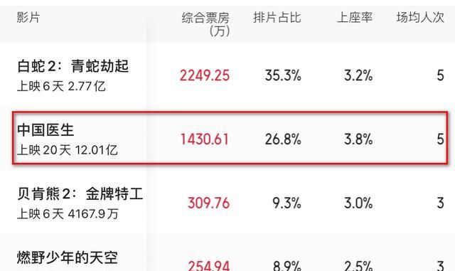 《中国医生》累计票房破了12亿。这部讲述抗击疫情的电影作品,带来了超高的热度,如今已经放映了19天,但仍旧有着不错的排片量,达到了2.68%,排在第二位,上座率为3.8%,排在热映四部电影中的第一名。这部电影单日票房达到了1400多万,排名第二。影片由刘伟强执导,演员阵容非常豪华,主要由《中国机长》的参与演员出演。