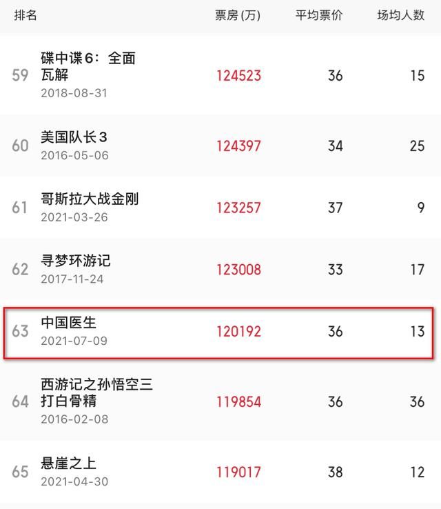 这部电影在破了12亿之后,排在总票房榜单的第63位,超过了《湄公河行动》的11.8亿和《悬崖之上》的11.9亿。
