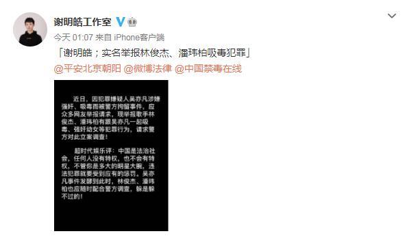 谢明皓工作室发文称:“谢明皓实名举报林俊杰、潘玮柏吸毒犯罪”,还在文末艾特了有关部门,还称林俊杰、潘玮柏和吴亦凡都有涉毒等犯罪行为,请求警方立案调查。