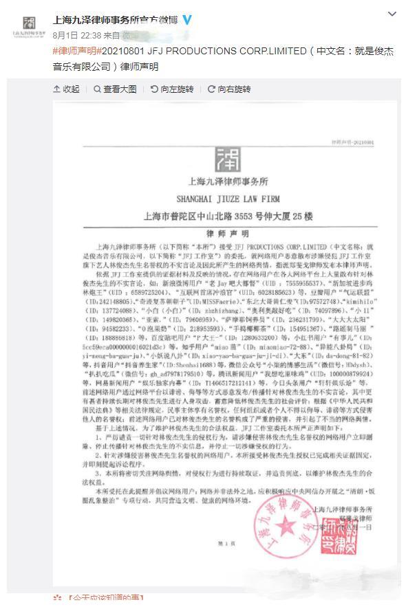 律师声明中,林俊杰开启了全平台维权,声明中称网络上很多用户发布了许多不实内容,对林俊杰名誉权造成损害,警告这些用户立刻停止侵权,并删除不实内容,停止一切侵权行为,林俊杰已经委托律师事务所对一些侵权用户进行了证据保存,后续会起诉维权。