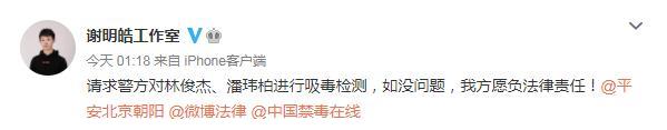 发布第一条微博后,谢明皓紧接着又发布了第二条微博,谢明皓写道:“请求警方对林俊杰、潘玮柏进行吸毒检测,如没问题,我方愿负法律责任”。