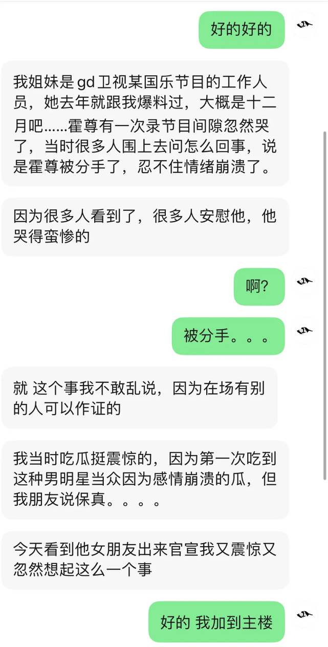 该知情人士表示,在2020年12月份录制一档国乐节目期间,霍尊有次在录制现场当众大哭。等现场嘉宾安慰了解之后,才知道霍尊是被分手了,所以情绪崩溃直接大哭。