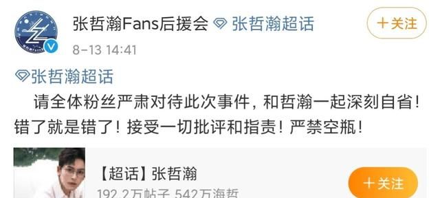 与此同时,张哲瀚工作室及相关后援会,都发文表示会吸取教训、弥补不足,与艺人共同学习成长。