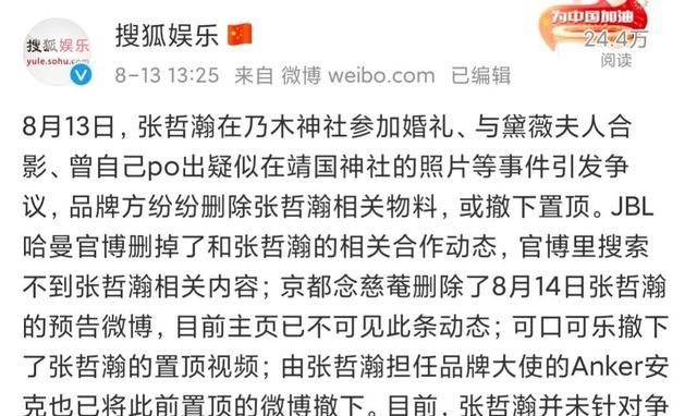 8月13日,张哲瀚曝出重大负面事件,被扒出与“靖国神厕”合影照片,引发全国网民声讨。
