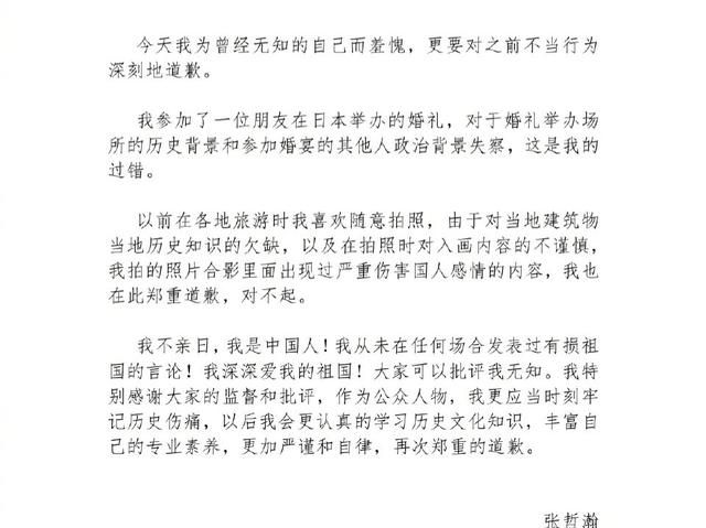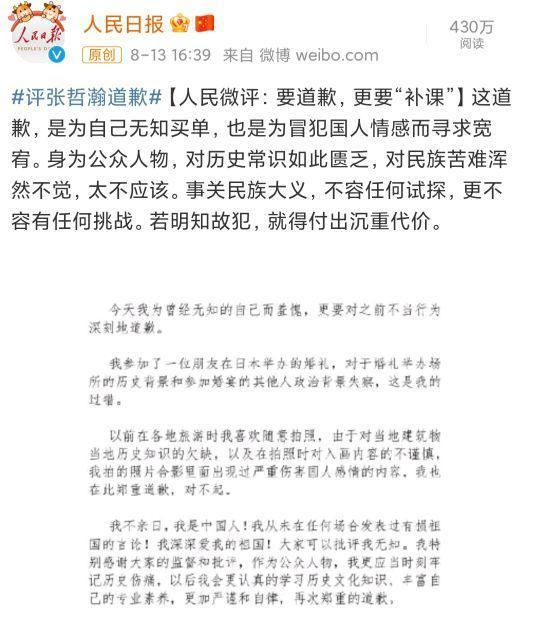 不过论最直接的,还是人民日报,直接就张哲瀚事件发声:“要道歉,更要“补课””,同时,文中还配上了张哲瀚的道歉声明。