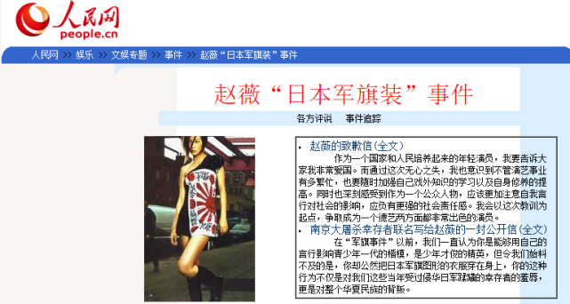 2001年,在《时装》杂志2001年第9期上,赵薇赫然披着一块“日本军旗”方巾!时隔3个月后,重庆某报又接到读者投诉,此事开始浮出水面。