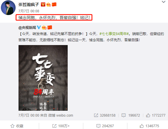 而他在微博中转发过的“七七事变”的内容,在这一刻又显得极其讽刺和悲哀。