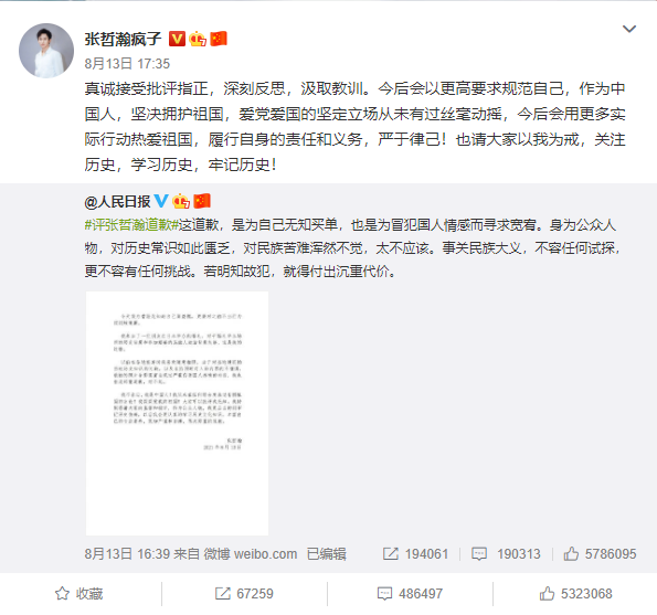 随后,张哲瀚微博也转发了人民日报的评论,并表示“也请大家以我为戒,关注历史,学习历史,牢记历史!”
